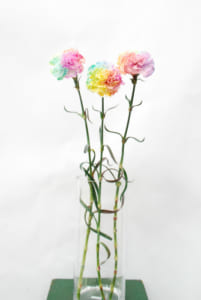 今週のショーケースは香川県、綾川花卉園さんのカーネーションを展示しました。 「綾川花卉園」は農家5人で1989年に設立し現在は3軒の農家が約1ヘクタールの敷地で約60品種を栽培しております。中でも香川県オリジナルの“ミニティアラ”は従来のカーネーションとは異なる花形で剣咲きタイプの小さい可愛らしい形が特徴です。またSTカーネーションのレインボー染めにも力を入れています。自ら開発された染色方法により短時間で数多くのレインボー染めを作りあげます。もうすぐ母の日です!是非ご注文お待ちしております。